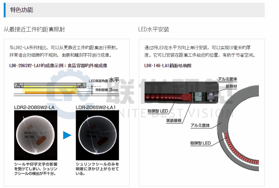 LED垂直地安裝在線形基板上。環形排列的LED彼此水平相對地照明。薄型設計,厚度為10mm。可以盡可能靠近工件使用。